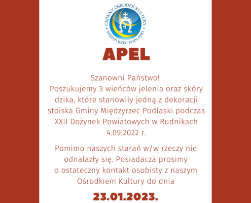 Szanowni Państwo! Poszukujemy 3 wieńców jelenia oraz skóry dzika, które stanowiły jedną z dekoracji stoiska gm. Międzyrzec Podlaski podczas XXII Dożynek Powiatowych w Rudnikach w dn. 4.09.2022 r. Pomimo naszych starań w/w rzeczy nie…