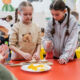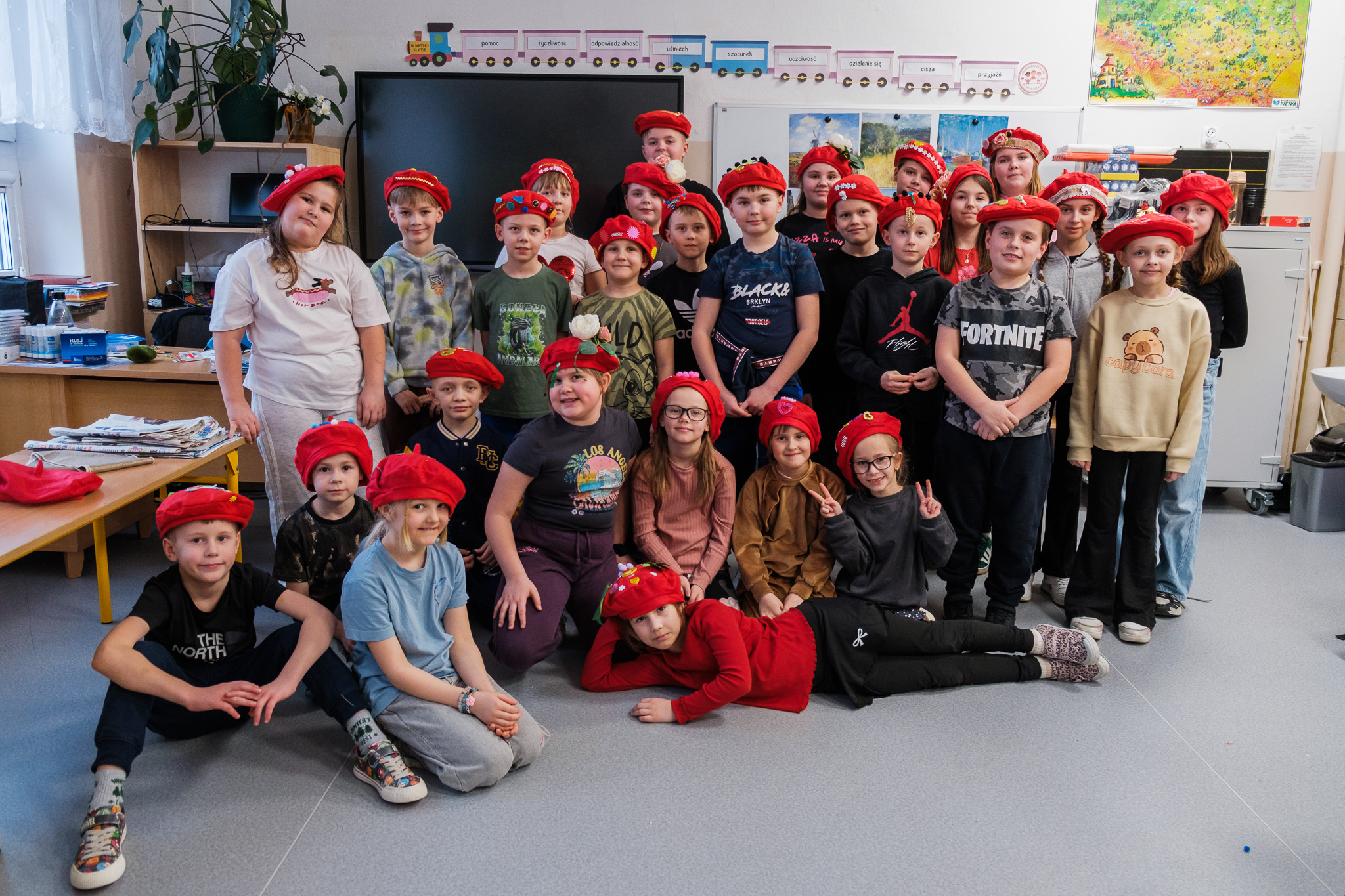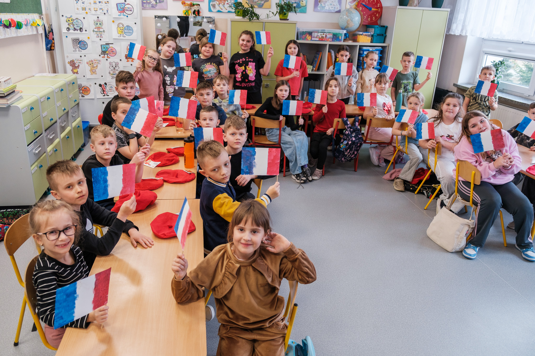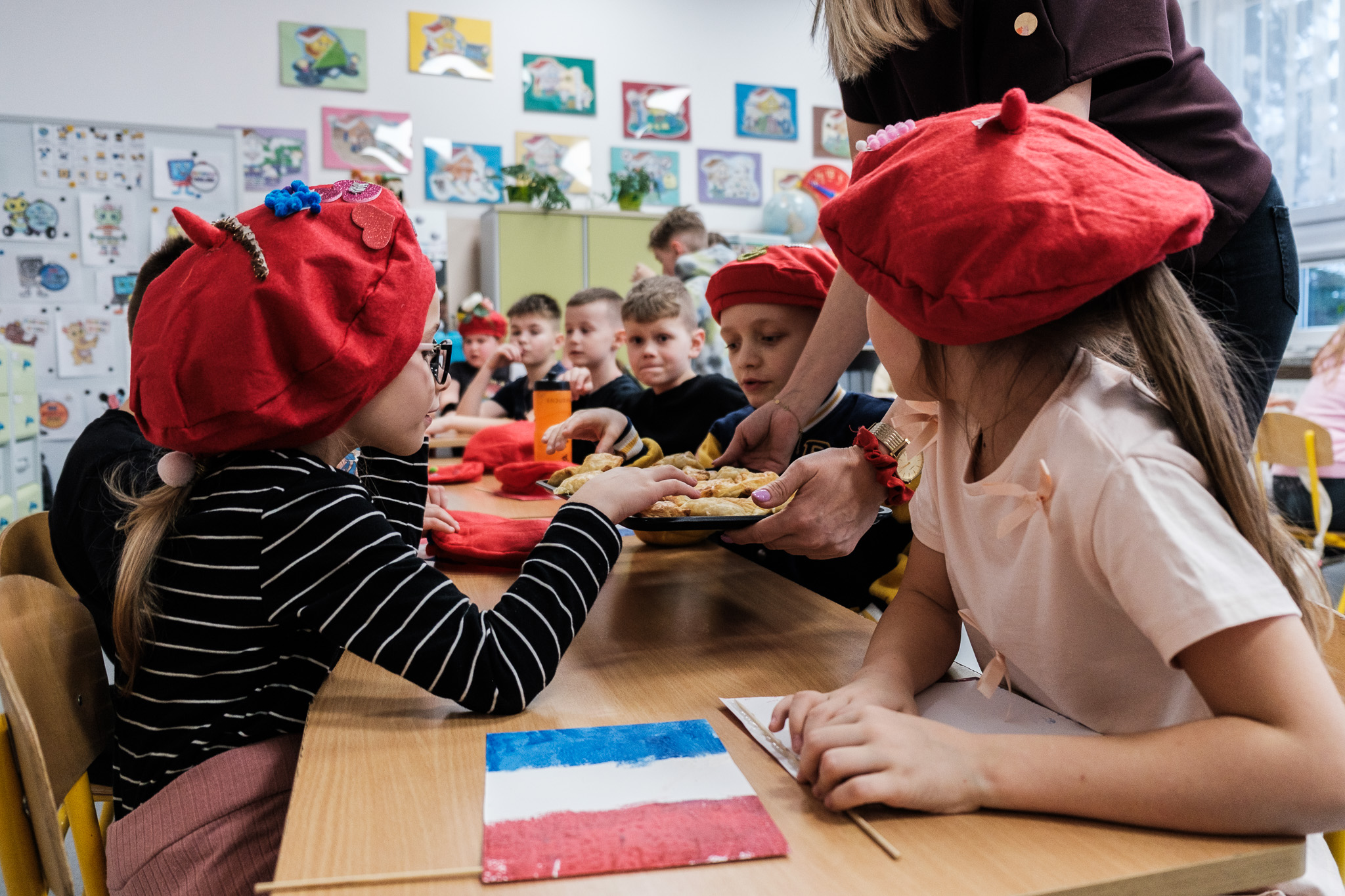 Nie zabrakło również zajęć plastycznych. Dzieci własnoręcznie wykonały flagi Francji oraz ozdabiały charakterystyczne czerwone berety, wprowadzając się w prawdziwie francuski klimat.