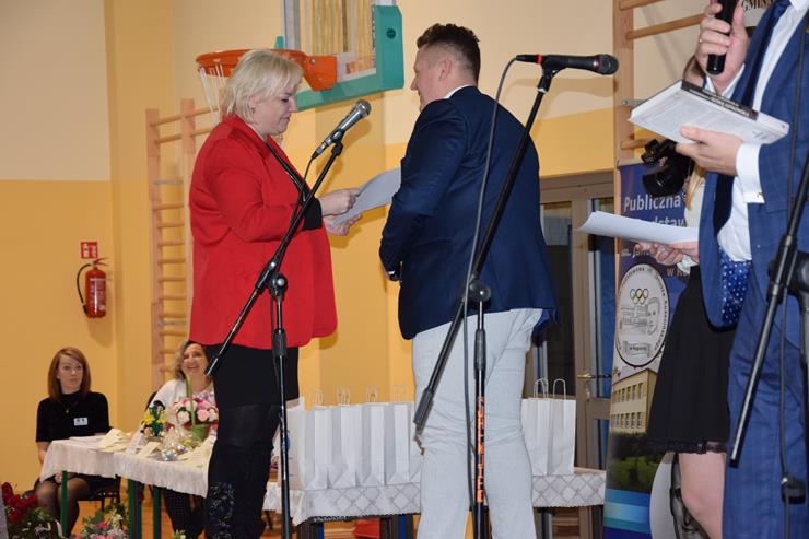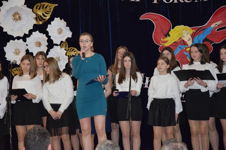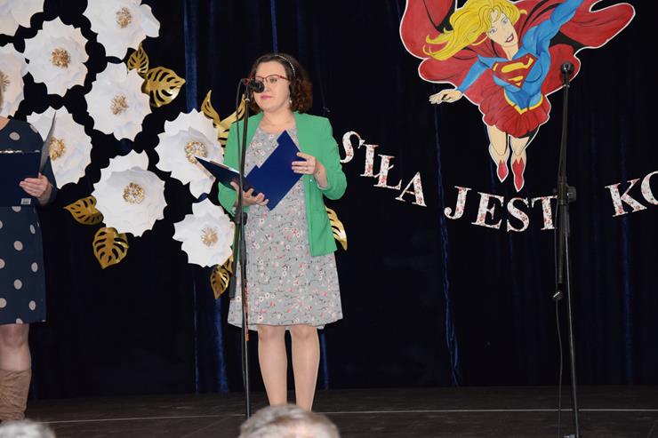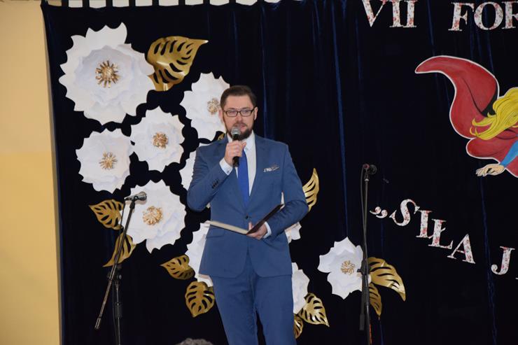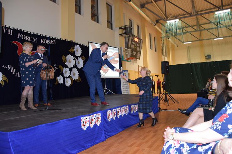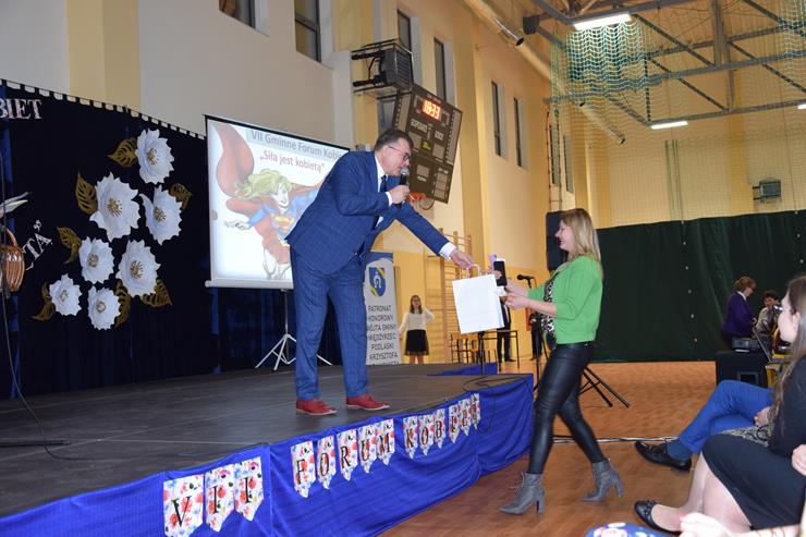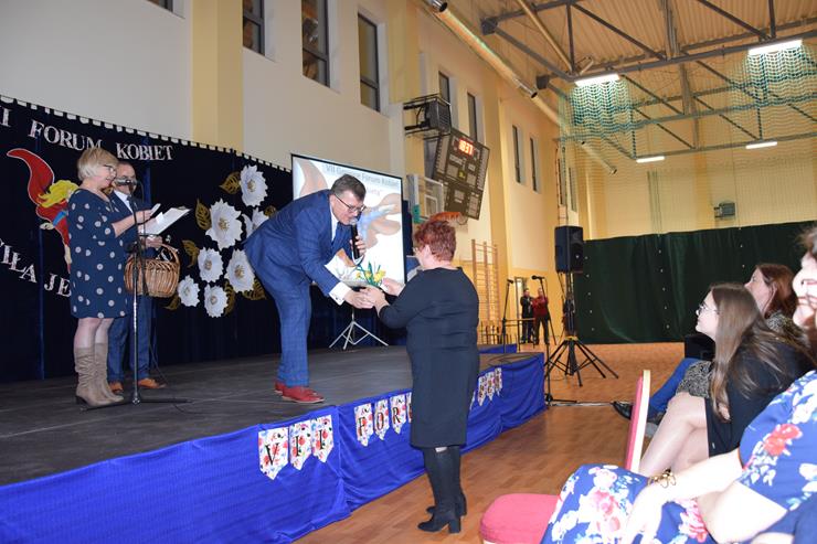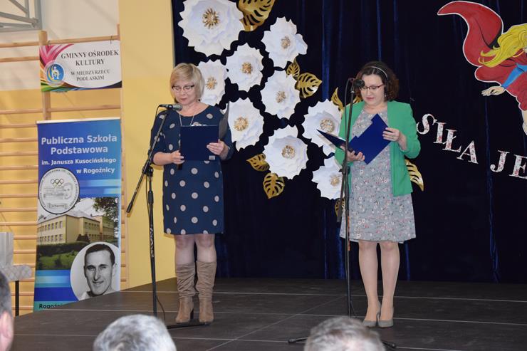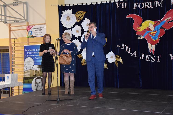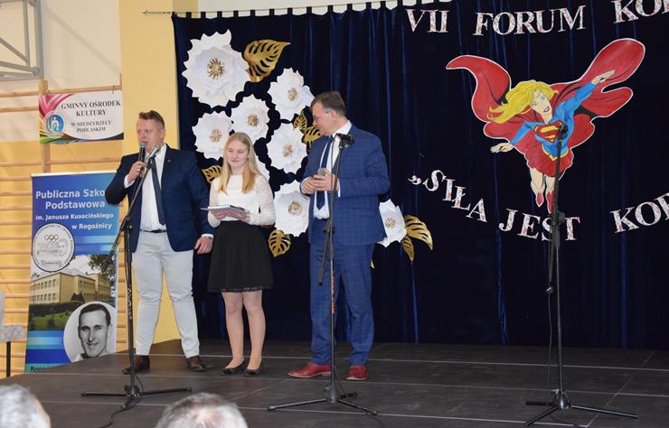 w Międzyrzecu Podlaskim oraz Elżbieta Baj – z-ca Dyrektora Gminnej Biblioteki Publicznej w Międzyrzecu Podlaskim z/s w Wysokim. Prowadzące powitały w pierwszej kolejności wszystkie kobiety uczestniczące w Forum. Życzenia złożyli paniom również Wójt Gminy Krzysztof Adamowicz w asyście Bartusia Skolimowskiego ucznia klasy 3 PSP w Rogoźnicy wręczając symboliczne bukiety kwiatów na ręce Dyrektor Szkoły Podstawowej w Rogoźnicy Pani Dorocie Herda oraz Agnieszce Chmielewskiej Radnej Gminy Międzyrzec Podlaski.