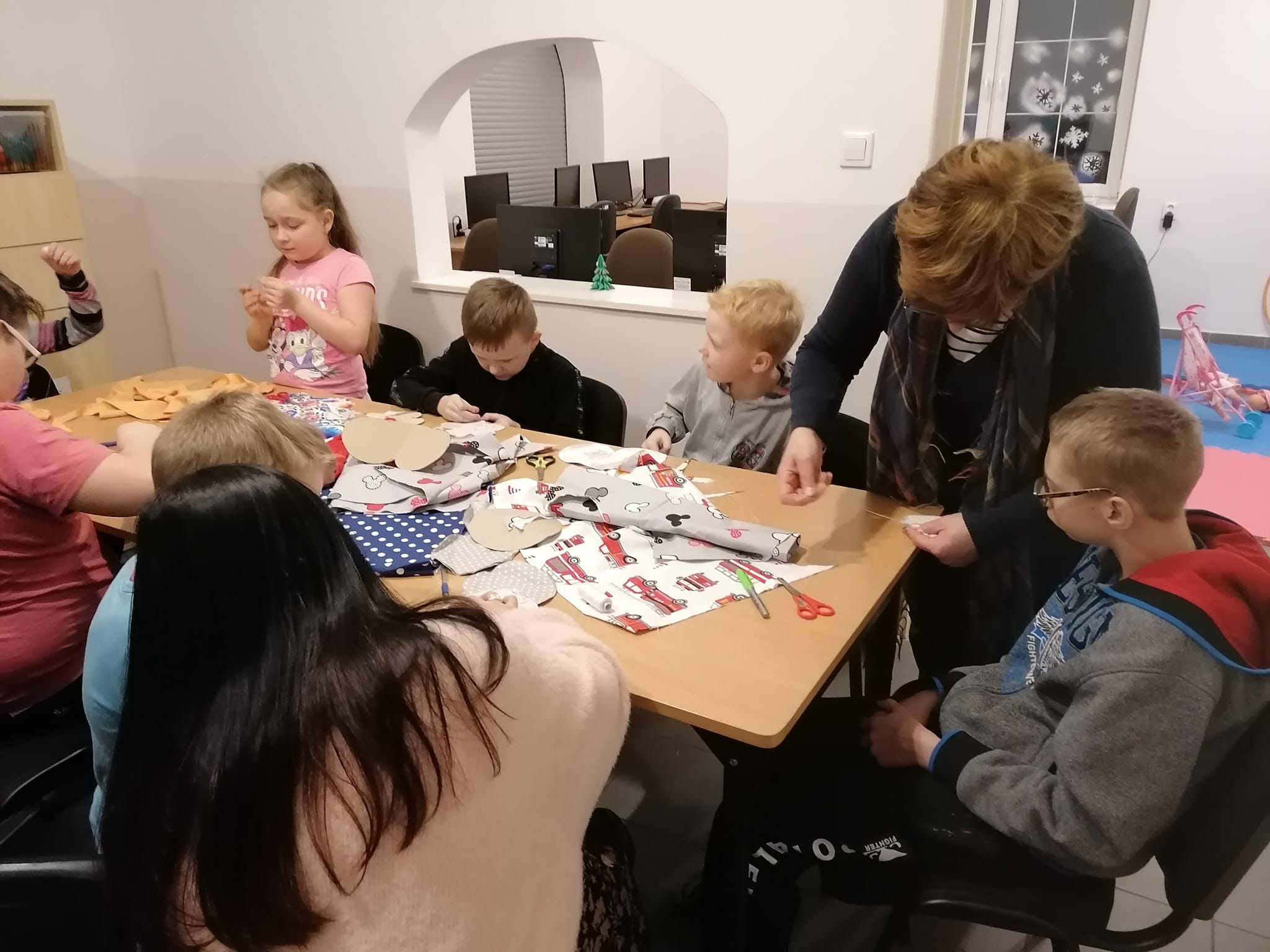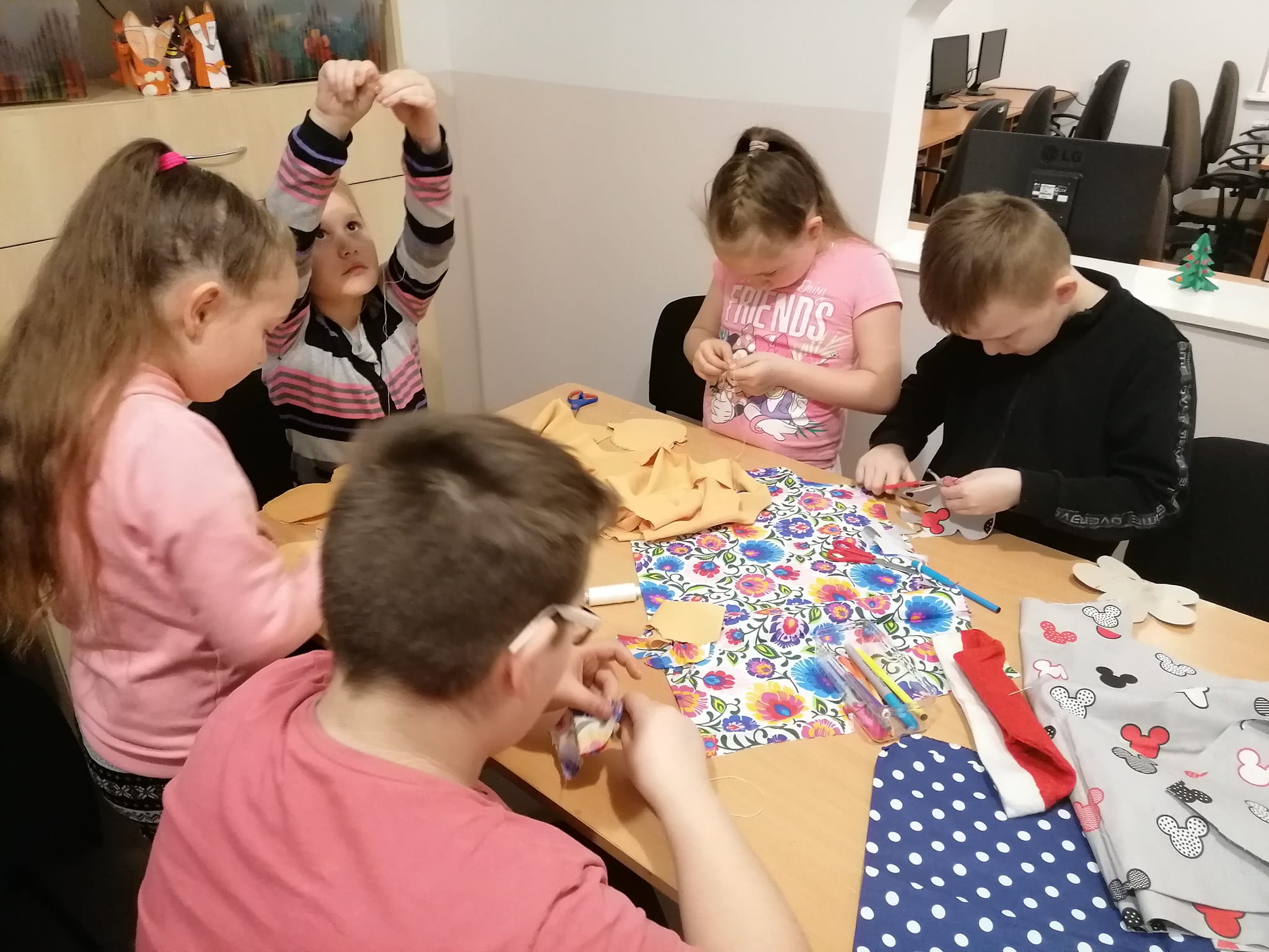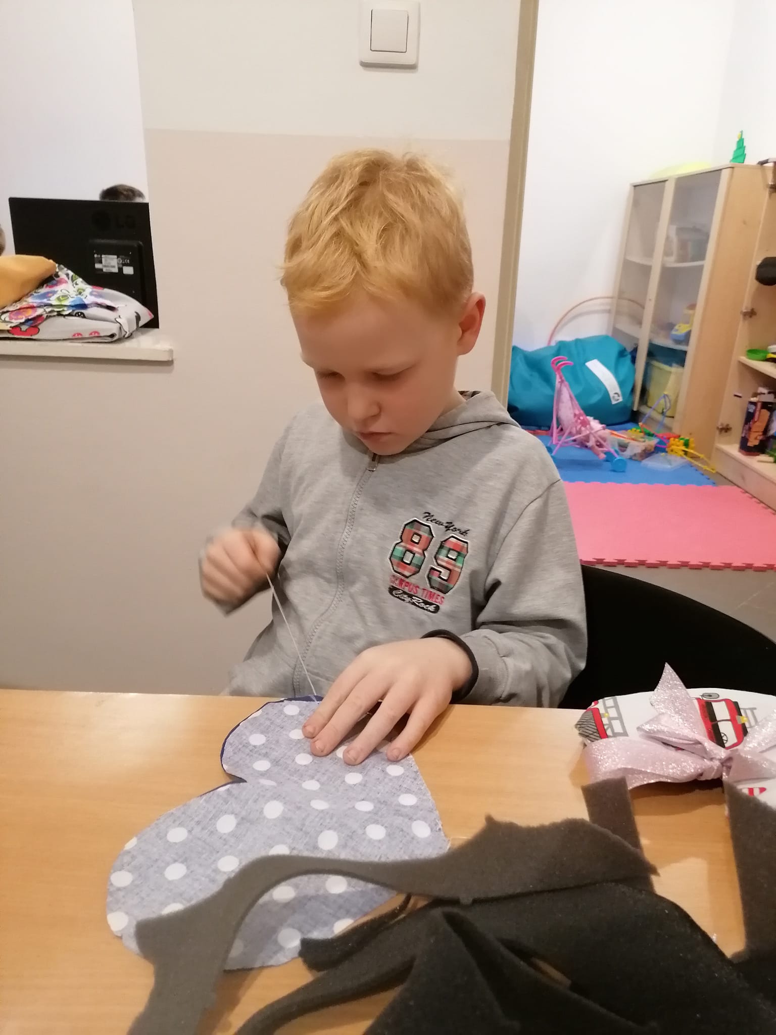 Dzieci podjęły wyzwanie i zrealizowały je pierwszorzędnie, wkładając w niełatwą sztukę szycia całe serca. Ćwiczyły przy tym małą motorykę, testowały faktury i rodzaje tkanin, uważność, poczucie estetyki i rozwijały kreatywność. Efekty prac zobaczycie Państwo na zdjęciach.