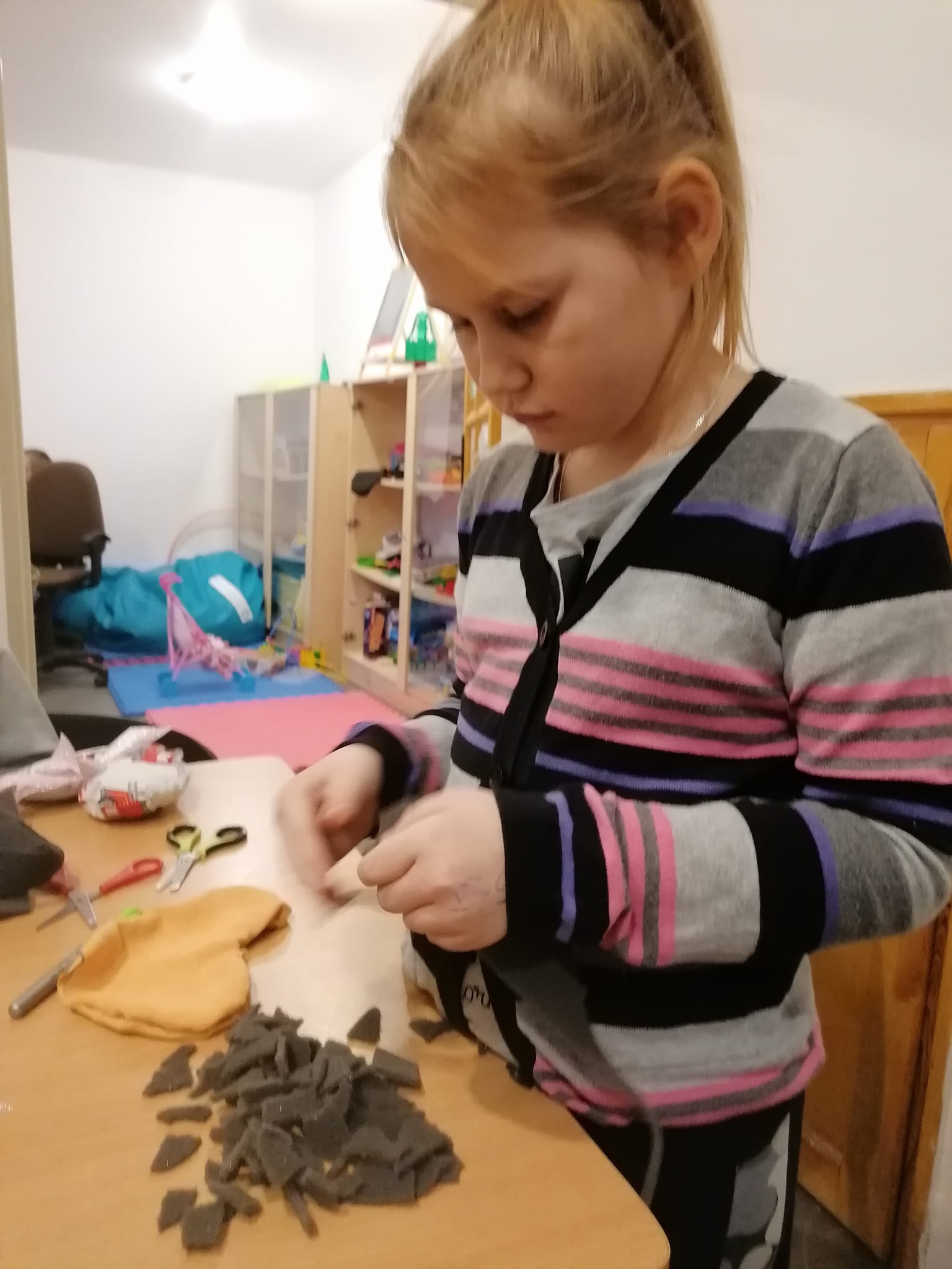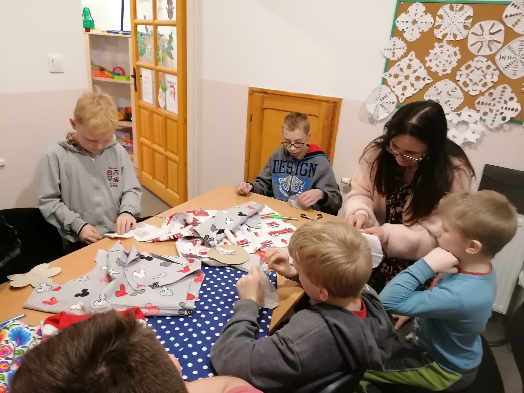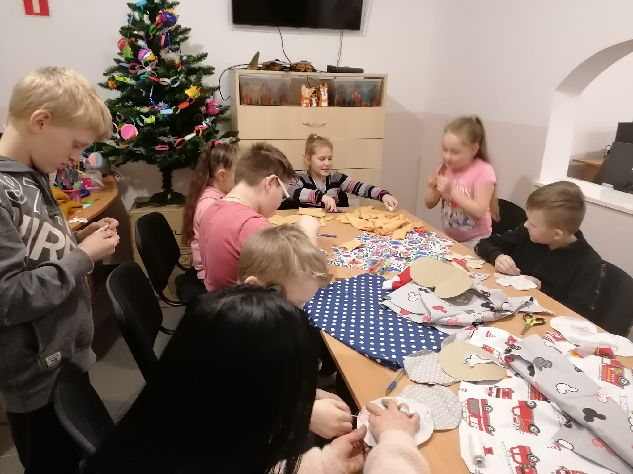 Dzieci podjęły wyzwanie i zrealizowały je pierwszorzędnie, wkładając w niełatwą sztukę szycia całe serca. Ćwiczyły przy tym małą motorykę, testowały faktury i rodzaje tkanin, uważność, poczucie estetyki i rozwijały kreatywność. Efekty prac zobaczycie Państwo na zdjęciach.