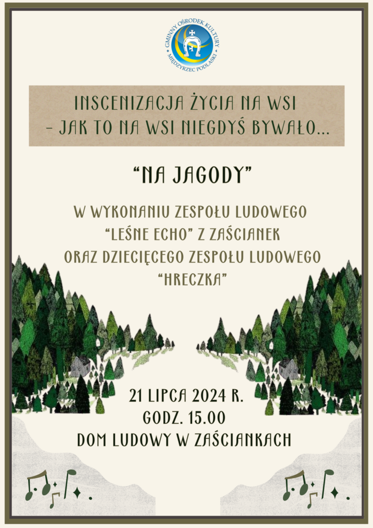 Już 21 lipca 2024 r. o godz. 15.00 zapraszamy Was na coroczne wydarzenie – teatr obrzędowy w ramach „Inscenizacji życia na wsi – jak to na wsi niegdyś bywało…”. W tym roku wybierzemy się „Na jagody”.
