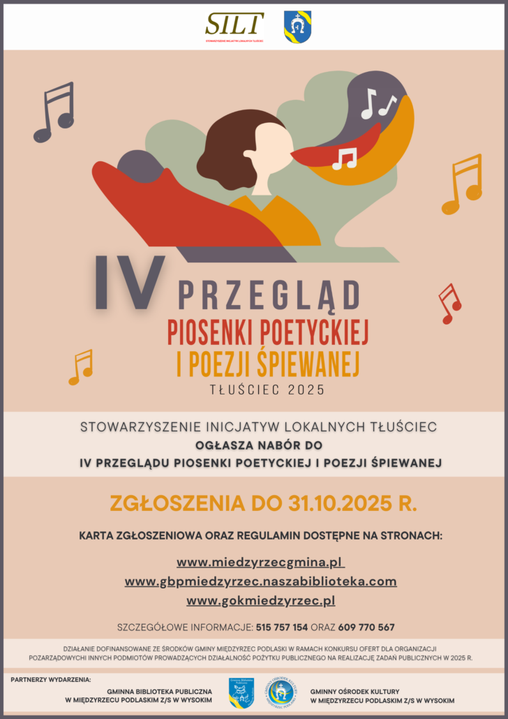 Stowarzyszenie Inicjatyw Lokalnych Tłuściec ogłasza nabór do IV Przeglądu Piosenki Poetyckiej i Poezji Śpiewanej, który odbędzie się 10 listopada 2025 r. w remizie OSP w Tłuśćcu.