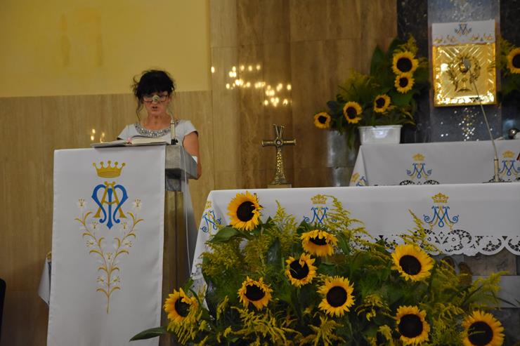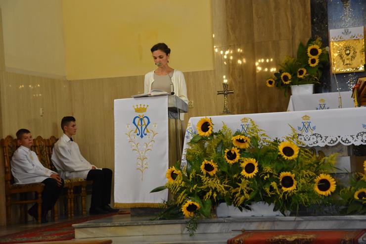 O godz. 11.00 p.o. Dyrektora Gminnego Ośrodka Kultury w Międzyrzecu Podlaskim Sylwia Hubica przywitała wszystkich zgromadzonych na uroczystości gości oraz zaprezentowała i przybliżyła sylwetki starostów dożynkowych, którymi byli Janina Pińczuk oraz Tadeusz Sawczuk. Po przekazaniu symbolicznego bochna chleba wypieczonego z tegorocznych zbóż i poświęceniu, Proboszcz Parafii, Wójt Gminy Krzysztof Adamowicz oraz zgromadzeni goście przeszli do kościoła gdzie uroczystą mszę św. w intencji rolnictwa i rolników Ziemi Międzyrzeckiej w podziękowaniu za tegoroczne plony odprawił Proboszcz parafii w Maniach ks. Andrzej Szymoniuk. W kazaniu podkreślił szczególną rolę rolników, których ciężka praca stanowi fundament funkcjonowania człowieka w wielu obszarach – codziennym, zawodowym, społecznym, kulturalnym i religijnym. Liturgia miała uroczysty charakter – w liturgii słowa wzięli udział członkowie lokalnej społeczności wraz z Wójtem Gminy Krzysztofem Adamowiczem, zaś dzieci i młodzież złożyły w ofierze dary eucharystyczne nawiązujące do ludowej tradycji polskiej wsi (chleb, wieniec, wodę, wino, kwiaty i zioła, owoce i święcę z wosku pszczelego).