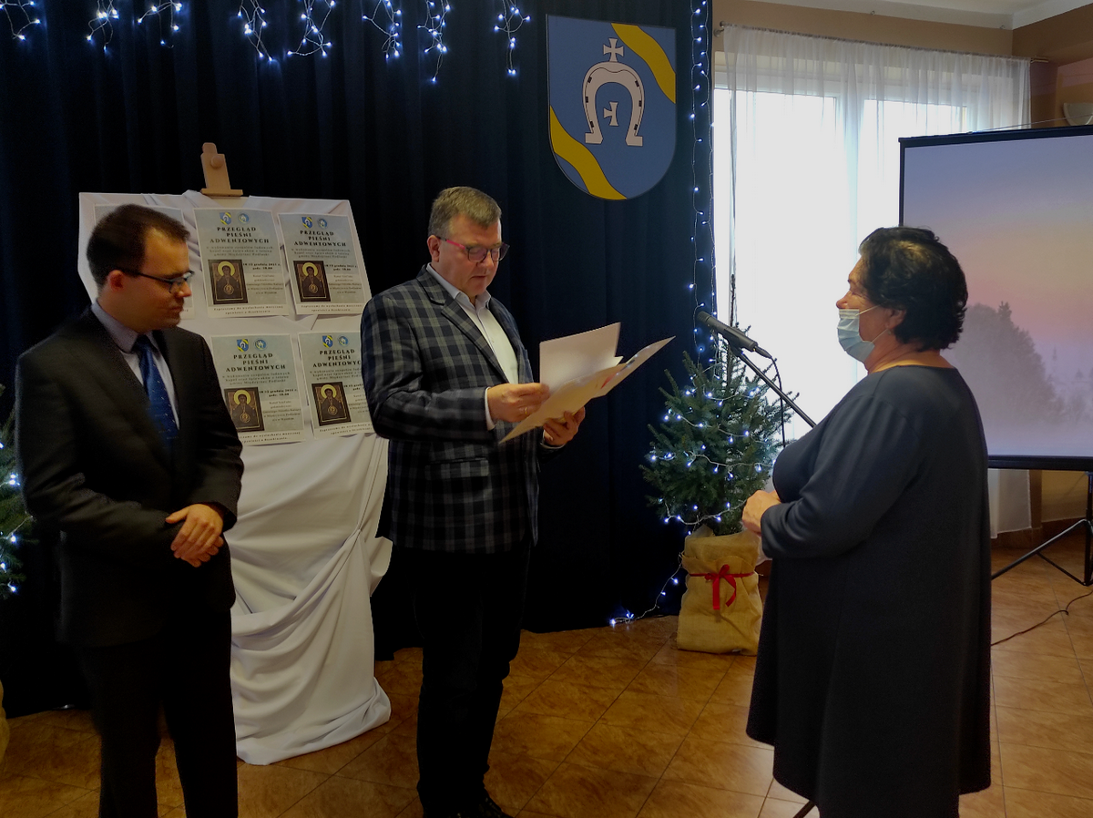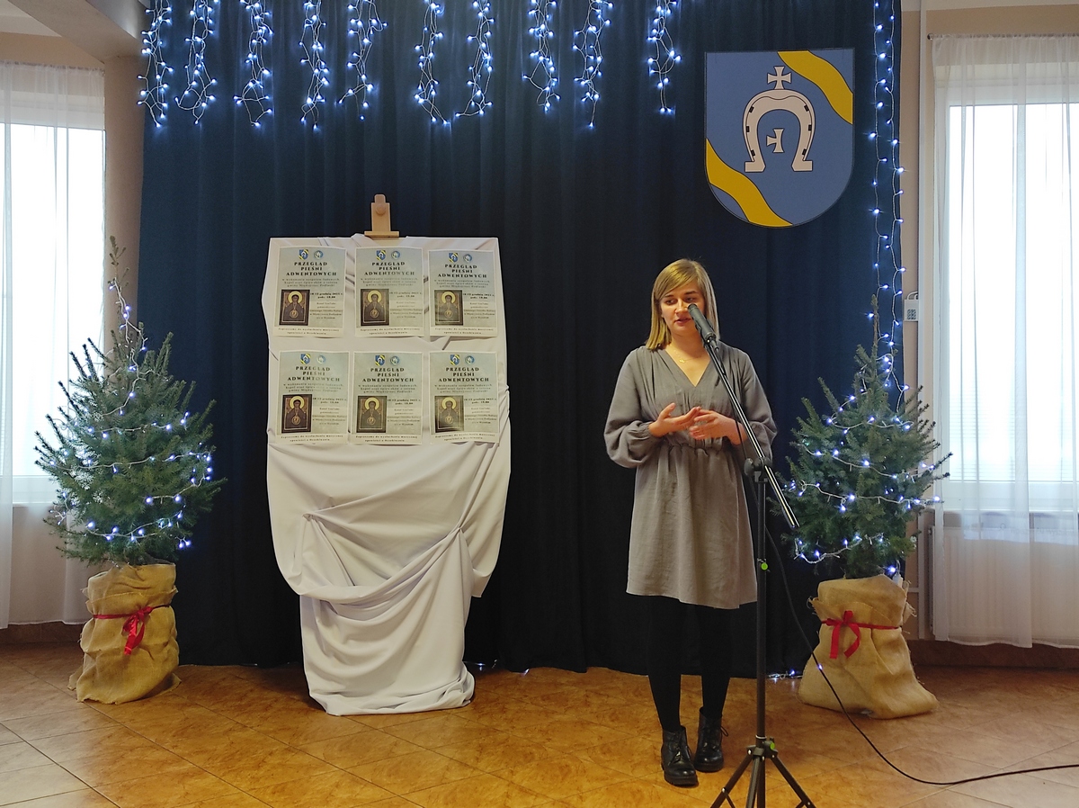 Podczas podsumowania konkursu uczestnicy połączyli się zdalnie z członkiem komisji konkursowej Pawłem Warownym, który wraz z pracownikiem Gminnego Ośrodka Kultury Angeliką Magier omówił z zebranymi kryteria brane pod uwagę podczas oceny prezentacji konkursowych. Członkowie komisji zwrócili szczególna uwagę na emisję i siłę głosu podczas wykonań a capella, na wartość starych i mało znanych pieśni z rodzinnych kantyczek, a także na konieczność zwracania uwagi na detale dotyczące prezentacji scenicznej. Wójt Gminy Krzysztof Adamowicz dziękował uczestnikom Przeglądu Pieśni Adwentowych, doceniając wkład i zaangażowanie, jakie włożyli w przygotowanie się do nagrań. Zachęcał również zespoły ludowe do nieustannego rozwoju, ponieważ to ich członkowie są nośnikiem lokalnej tradycji, którą należy pielęgnować i promować, zarówno podczas lokalnych wydarzeń, ale także w eliminacjach do konkursów krajowych. Uczestnikom Przeglądu dziękował również Zastępca Wójta Gminy Michał Teofilski. Ponadto, Dyrektor GOK Sylwia Hubica zadeklarowała organizację w przyszłym roku gminnych eliminacji do Powiatowego Przeglądu Kapel i Śpiewaków Ludowych.