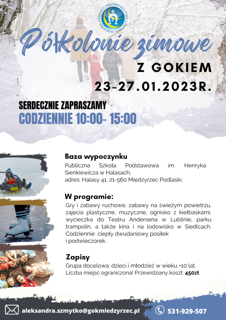 W programie przewidujemy integracyjne gry i zabawy ruchowe, animacje kulturalne, wycieczki na łyżwy, do parku trampolin, do Teatru Andersena w Lublinie i wiele innych atrakcji. Koszt półkolonii z uwzględnieniem biletów, transportu na wycieczki oraz wyżywienia w postaci jednego 2-daniowego posiłku dziennie oraz podwieczorku wynosi 450 zł za jedno dziecko. Zachęcamy do kontaktu telefonicznego i mailowego oraz do zapisów.