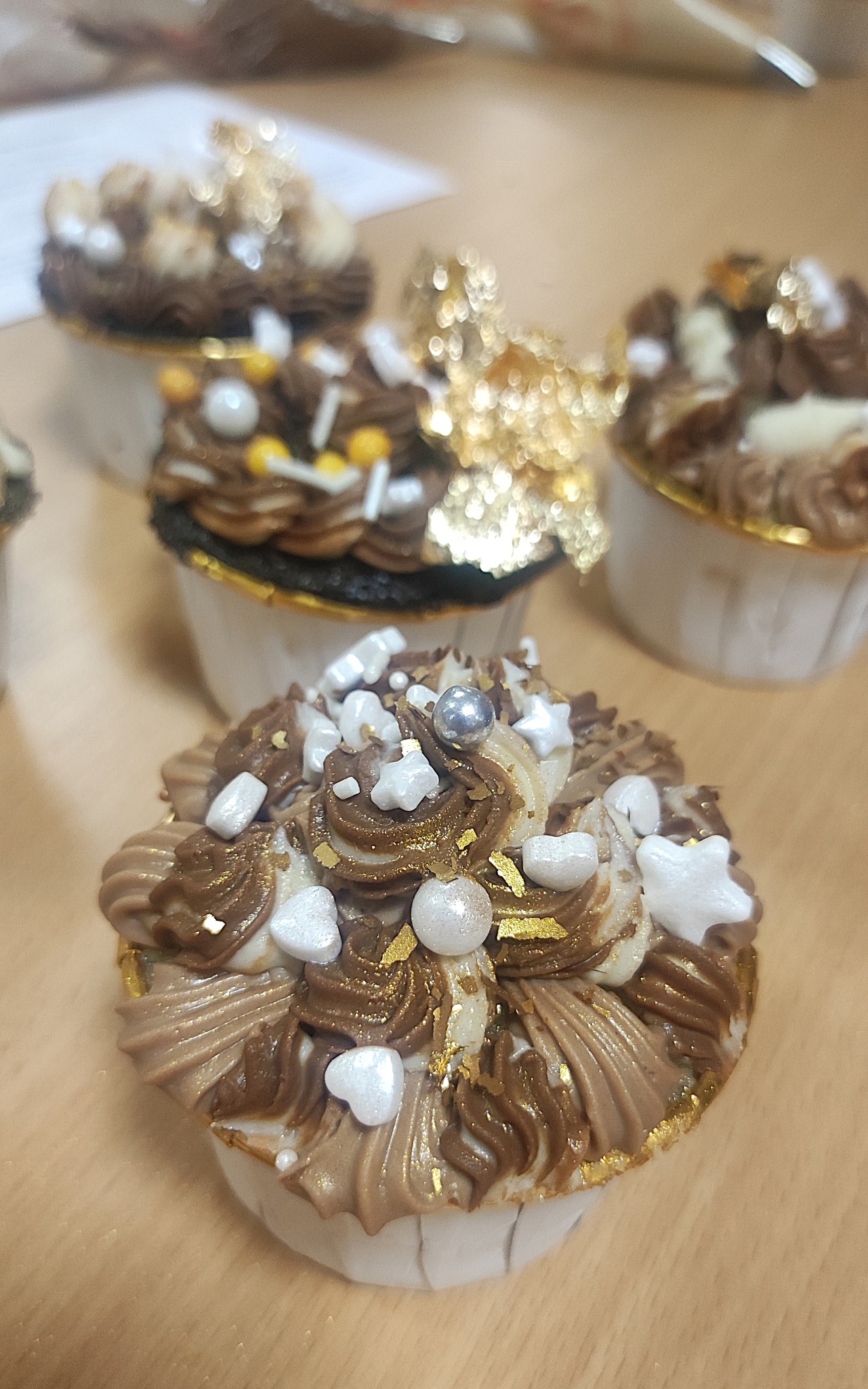 Nabyte umiejętności wykorzystały, ozdabiając upieczone wcześniej babeczki. W trakcie warsztatów nie brakowało uśmiechów, kreatywności i mnóstwa inspiracji. Każda z uczestniczek miała okazję stworzyć unikalne kompozycje, łącząc różnorodne techniki dekoratorskie, od kolorowych lukrów po delikatne kwiatowe akcenty.