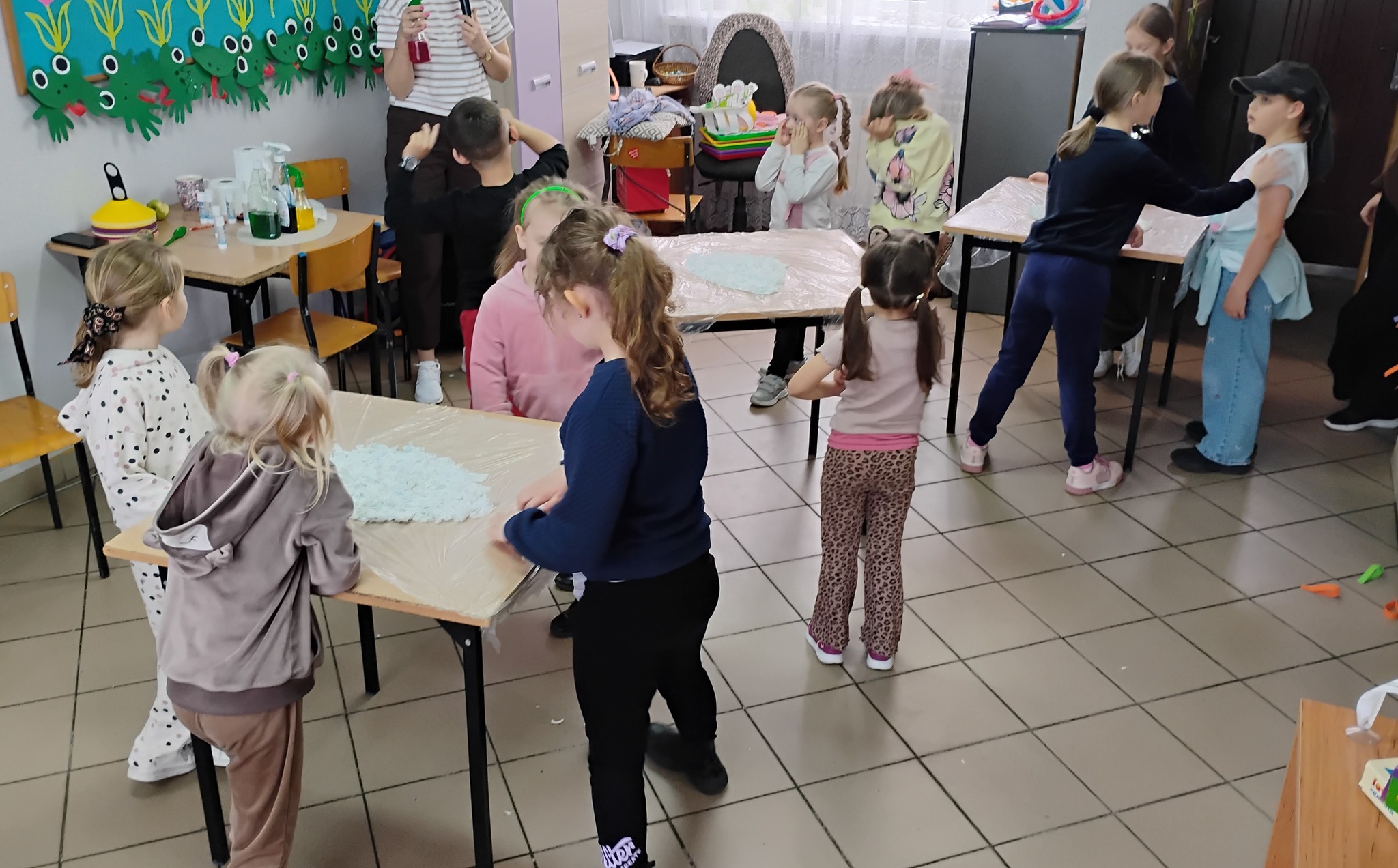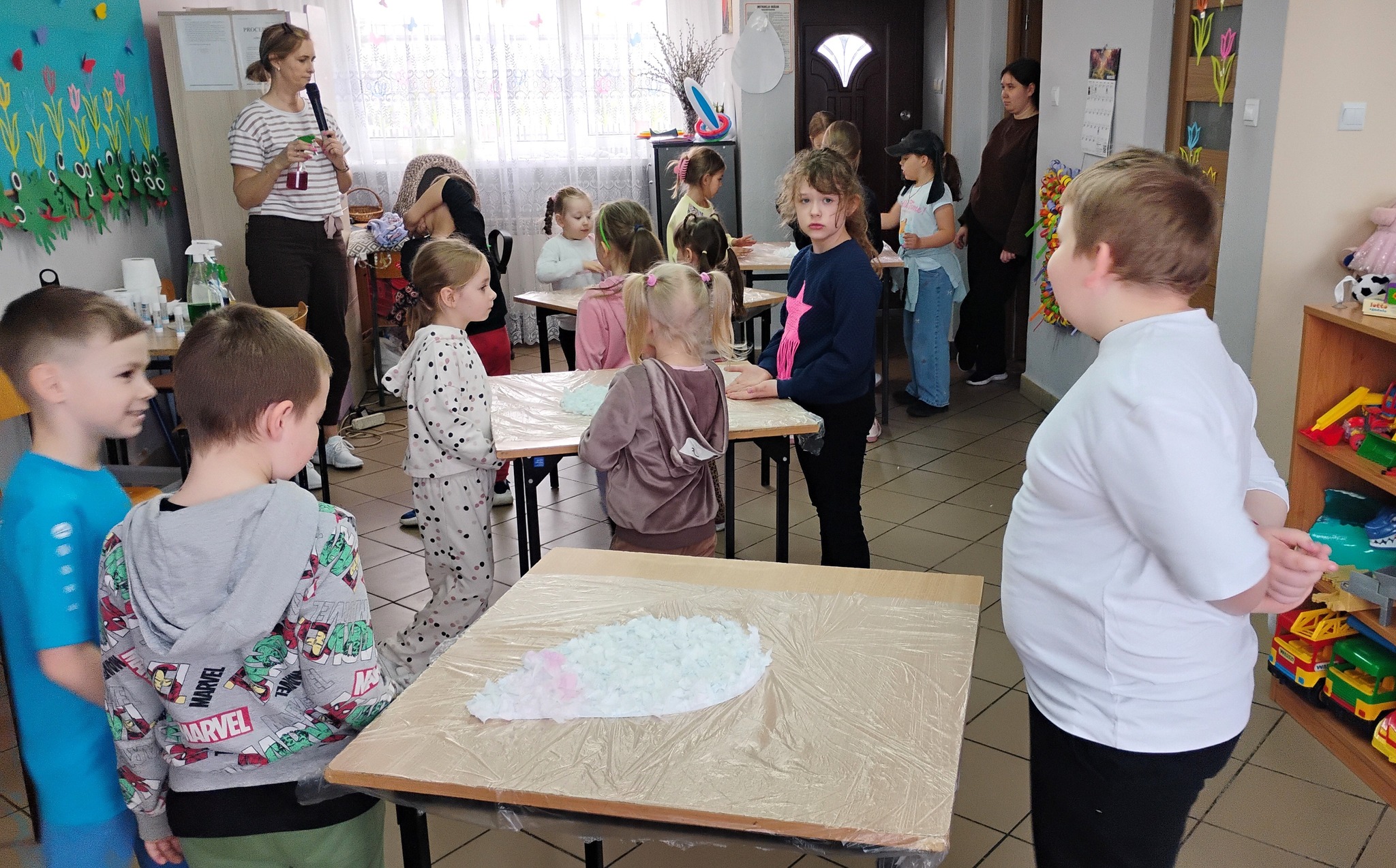 Nie zabrakło również części kreatywnej. Dzieci przygotowywały wielkanocne pisanki, które ozdabiały kolorowymi sprayami, tworząc barwną i efektowną dekorację.